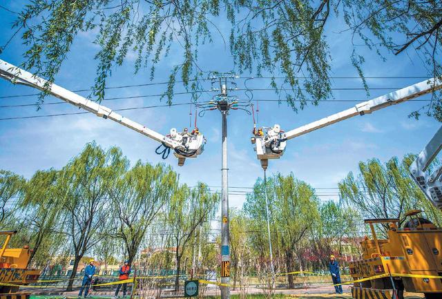 國網(wǎng)北京電力帶電作業(yè)人員在海淀區(qū)西北旺永豐地區(qū)進(jìn)行配電網(wǎng)帶電綜合檢修作業(yè)。劉小軍 攝