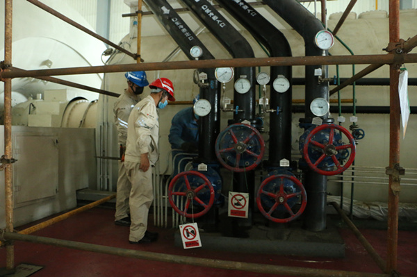 攻堅(jiān)克難,保機(jī)組穩(wěn)定運(yùn)行。大鵬之動(dòng),非一羽之輕也;騏驥之速,非一足之力也。盛夏的廠房?jī)?nèi)異常悶熱,機(jī)組設(shè)備發(fā)出來的熱量讓人喘不過氣來,就在這種條件下,該廠干部職工為了快速消除缺陷,不懼困難,連續(xù)奮戰(zhàn)在現(xiàn)場(chǎng)。總工程師叮囑大家注意安全,輪換休息,防止中暑,并協(xié)調(diào)解決工器具及材料,查看作業(yè)環(huán)境,檢查安全措施;設(shè)備部積極與哈爾濱電機(jī)廠取得聯(lián)系,請(qǐng)專業(yè)人員入廠探討解決方法,同時(shí)編制安全技術(shù)組織措施方案,解決設(shè)備作業(yè)過程中遇到的技術(shù)性問題,對(duì)設(shè)備作業(yè)過程中出現(xiàn)的質(zhì)量問題提出整改意見;安監(jiān)部強(qiáng)化監(jiān)督,從兩票控制措施執(zhí)行、腳手架及現(xiàn)場(chǎng)防爆行燈漏電保護(hù)器的使用情況到確認(rèn)施工現(xiàn)場(chǎng)氫氣含量等無死角的全程檢查盯守,為消缺工作保駕護(hù)航;發(fā)電部運(yùn)行人員全力配合,嚴(yán)格按照工作票所列危險(xiǎn)點(diǎn)布置安全措施,開關(guān)閥門,在檢修期間密切監(jiān)視發(fā)電機(jī)風(fēng)溫,發(fā)現(xiàn)問題及時(shí)對(duì)參數(shù)進(jìn)行調(diào)整,在保證機(jī)組安全運(yùn)行的基礎(chǔ)上,為消缺工作創(chuàng)造便利條件;電氣車間電機(jī)班人員分解氫冷器冷卻水出、入口法蘭短接及彎頭,在氫冷器冷卻水入口法蘭處加裝堵板,把配制好的藥液從氫冷器冷卻水出口彎頭處注滿氫冷器。工作中大家分工明確,忙而不亂,盡管現(xiàn)場(chǎng)氣溫高,卻沒有阻擋大家的干勁。