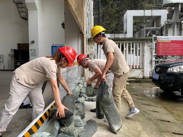 9月16日17時,公司開啟三孔閘門進行泄洪,按照公司防汛總值班室命令和Ⅱ級橙色預警防洪預案要求,公司全員團結協(xié)作、井然有序進行防洪搶險工作。首先恢復各大門防洪擋板,用沙袋封堵廠房大門,其次檢查泄洪兩側山體、道路交通情況,并拉設警戒線嚴禁大壩通行,同時對廠房外側墻體孔洞進行巡查,嚴防有水滲入。晚上19時,因泄洪對廠房玻璃造成損壞,公司采取臨時緊急措施用木板進行封堵,并用沙袋進行引水隔離,避免積水流入的發(fā)電機層導致設備短路而引起重大設備事故。