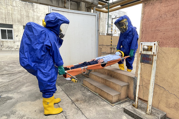 此次演練模擬液氨儲(chǔ)罐出口母管至3號(hào)液氨蒸發(fā)器一次門前法蘭漏氨,造成氨站現(xiàn)場氨濃度高,人員在現(xiàn)場暈倒。事故開始后,集控室發(fā)出報(bào)警,氨站雨淋閥自動(dòng)噴淋裝置自動(dòng)開啟,迅速啟動(dòng)液氨泄露現(xiàn)場應(yīng)急響應(yīng),值長下達(dá)營救受傷人員的命令,運(yùn)行人員穿戴防護(hù)服、防毒面具及正壓式呼吸器,對(duì)事故現(xiàn)場人員轉(zhuǎn)移搶救、漏點(diǎn)查找、漏點(diǎn)隔離、管道氨置換及漏點(diǎn)處理等操作,消防車到達(dá)現(xiàn)場,消防人員全程對(duì)漏點(diǎn)進(jìn)行消防水噴射,協(xié)助現(xiàn)場漏氨處理,保安人員在現(xiàn)場進(jìn)行隔離和安保警戒。整場演練,參演人員各司其職、密切配合,事故處理及時(shí)準(zhǔn)確,氨區(qū)設(shè)備正常運(yùn)行,隱患排除。