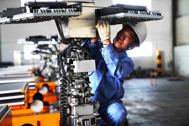 圖為作業(yè)人員在篩分車間檢修移動(dòng)照明燈
