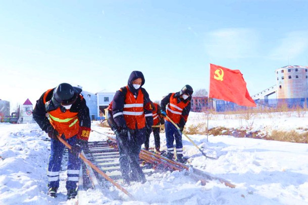 雁寶能源黨員突擊隊清掃鐵路上的積雪保障外運安全