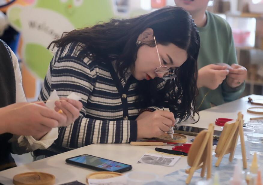 活動中大家興致勃勃地上手在木質(zhì)杯墊上制作琺瑯畫,用細(xì)膩柔軟的金絲,貼在裝飾圖紋上,通過配色、填沙等步驟,逐步制作出一件件別具一格、匠心獨(dú)制的藝術(shù)作品,大家興趣盎然,彼此交流,共同分享動手制作的體會和收獲的喜悅,共品非遺藝術(shù)魅力。掐絲琺瑯工藝是一種傳統(tǒng)的中國手工藝,用金屬細(xì)絲掐出圖案后填充各種顏色的琺瑯彩料,經(jīng)過多道工序,制成精美器物。本次體驗(yàn)活動進(jìn)行掐絲琺瑯手工杯墊制作,作品可以永久保存,永不褪色,并具有很好的觀賞性和收藏價(jià)值。