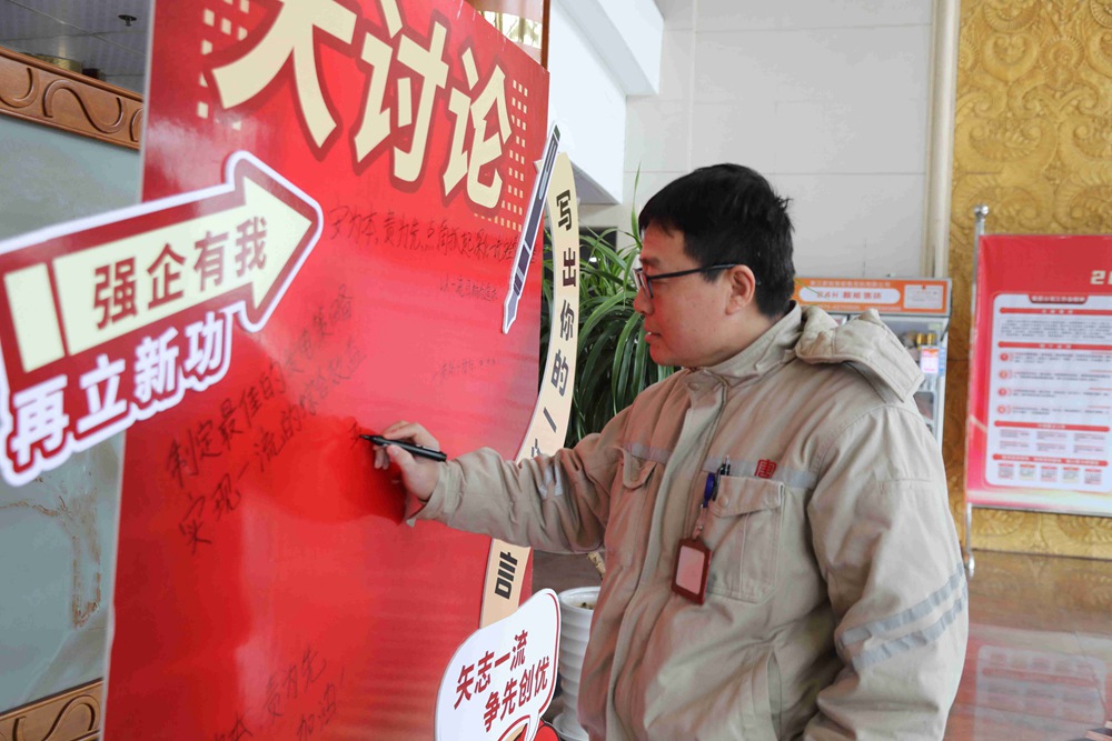 打卡,不僅是對(duì)目標(biāo)的記錄,更是對(duì)自我成長的見證;誓言,不僅是對(duì)未來的期許,更是對(duì)責(zé)任的擔(dān)當(dāng)?;顒?dòng)現(xiàn)場(chǎng),職工們依次有序地走向留言板,紛紛在展板上“落筆為誓”,一筆一劃地寫出自己的一流誓言,表達(dá)著自己誓要“矢志一流爭(zhēng)先創(chuàng)優(yōu) 強(qiáng)企有我再立新功”的堅(jiān)定決心。“制定最佳的發(fā)電策略,實(shí)現(xiàn)一流的綜合效益”“建設(shè)一流的供應(yīng)鏈,筑牢企業(yè)成本優(yōu)勢(shì)”“深挖設(shè)備潛能,爭(zhēng)創(chuàng)一流能耗水平”“安為本,責(zé)為先,點(diǎn)滴抓起深化一流安全管理”……一句句熱血的誓言充盈著整張展板,他們筆下的每一個(gè)字都充滿了力量和奮斗的光芒,激勵(lì)著每一位職工把承諾深深鐫刻在心里,并轉(zhuǎn)化為實(shí)際行動(dòng)。
