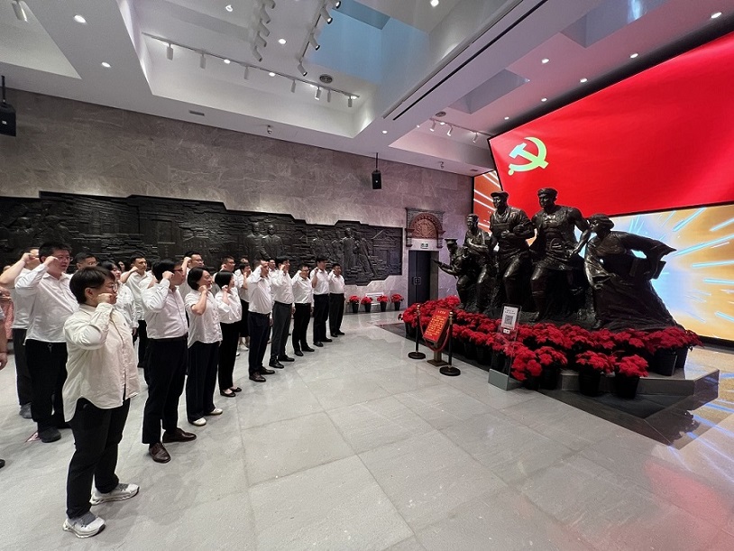 在紀念館內(nèi),上海公司黨員干部沿著歷史脈絡(luò),通過多媒體互動技術(shù)身臨其境地感受了1925年中共四大召開的生動場景,一件件珍貴的館藏文物、一幅幅生動的歷史圖片、一段段詳實的文字記錄,全方位展現(xiàn)了中共四大在黨的歷史上的重要意義。在黨旗下,全體黨員佩戴黨徽,舉起右拳,一起重溫入黨誓詞,用發(fā)自內(nèi)心的聲音表達對黨的絕對忠誠,共同說出為共產(chǎn)主義奮斗終身的鏗鏘誓言。