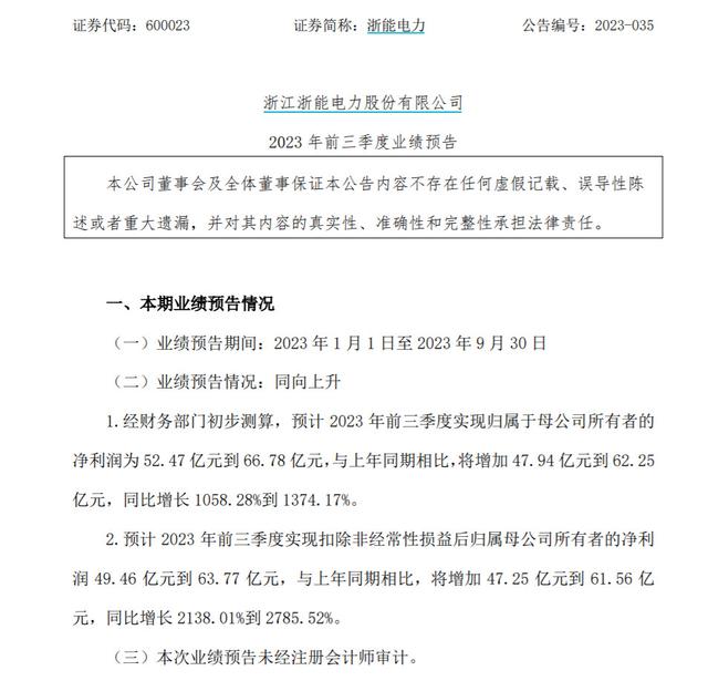 浙能電力稱,經(jīng)財(cái)務(wù)部門初步測(cè)算,預(yù)計(jì)2023年前三季度實(shí)現(xiàn)歸屬于母公司所有者的凈利潤為52.47億元到66.78億元,與上年同期相比,將增加47.94億元到62.25億元,同比增長1058.28%到1374.17%。預(yù)計(jì)2023年前三季度實(shí)現(xiàn)扣除非經(jīng)常性損益后歸屬母公司所有者的凈利潤49.46億元到63.77億元,與上年同期相比,將增加47.25億元到61.56億元,同比增長2138.01%到2785.52%。
