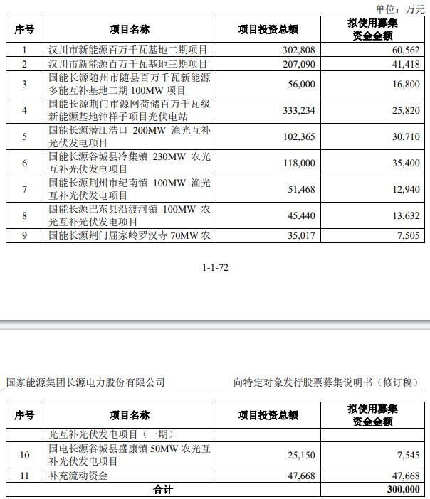長(zhǎng)源電力向特定對(duì)象發(fā)行股票募集說(shuō)明書(shū)(修訂稿)(2023年三季度財(cái)務(wù)數(shù)據(jù)更新版)顯示,本次發(fā)行股票募集資金總額不超過(guò)300,000萬(wàn)元(含本數(shù)),扣除發(fā)行費(fèi)用后的募集資金凈額將用于漢川市新能源百萬(wàn)千瓦基地二期項(xiàng)目、漢川市新能源百萬(wàn)千瓦基地三期項(xiàng)目、國(guó)能長(zhǎng)源隨州市隨縣百萬(wàn)千瓦新能源多能互補(bǔ)基地二期100MW項(xiàng)目、國(guó)能長(zhǎng)源荊門市源網(wǎng)荷儲(chǔ)百萬(wàn)千瓦級(jí)新能源基地鐘祥子項(xiàng)目光伏電站、國(guó)能長(zhǎng)源潛江浩口200MW漁光互補(bǔ)光伏發(fā)電項(xiàng)目、國(guó)能長(zhǎng)源谷城縣冷集鎮(zhèn)230MW農(nóng)光互補(bǔ)光伏發(fā)電項(xiàng)目、國(guó)能長(zhǎng)源荊州市紀(jì)南鎮(zhèn)100MW漁光互補(bǔ)光伏發(fā)電項(xiàng)目、國(guó)能長(zhǎng)源巴東縣沿渡河鎮(zhèn)100MW農(nóng)光互補(bǔ)光伏發(fā)電項(xiàng)目、國(guó)能長(zhǎng)源荊門屈家?guī)X羅漢寺70MW農(nóng)光互補(bǔ)光伏發(fā)電項(xiàng)目(一期)、國(guó)電長(zhǎng)源谷城縣盛康鎮(zhèn)50MW農(nóng)光互補(bǔ)光伏發(fā)電項(xiàng)目、補(bǔ)充流動(dòng)資金。