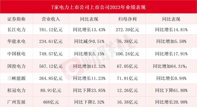 具體來看,總市值超6000億元的長江電力2023年?duì)I收、凈利同比雙增,實(shí)現(xiàn)營業(yè)收入781.12億元,同比增長13.43%;歸母凈利潤272.39億元,同比增長14.81%。公司水電總裝機(jī)容量7179.5萬千瓦,排名全球第一。
