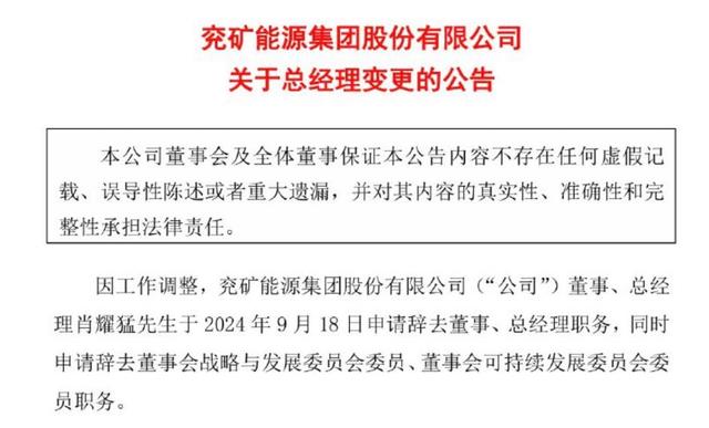 9月18日晚,兗礦能源(600188.SH)公告,因工作調整,公司董事、總經理肖耀猛當天申請辭去董事、總經理職務,同時辭去董事會戰(zhàn)略與發(fā)展委員會委員、董事會可持續(xù)發(fā)展委員會委員職務。