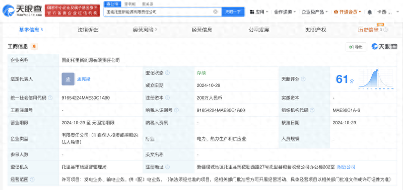 據(jù)天眼查顯示,國能托里新能源有限責(zé)任公司于近日成立,注冊資本200萬元,經(jīng)營范圍為發(fā)電業(yè)務(wù)、輸電業(yè)務(wù)、供(配)電業(yè)務(wù)。該公司由國家能源集團新疆能源有限責(zé)任公司全資持股,后者為國家能源投資集團有限責(zé)任公司全資子公司。