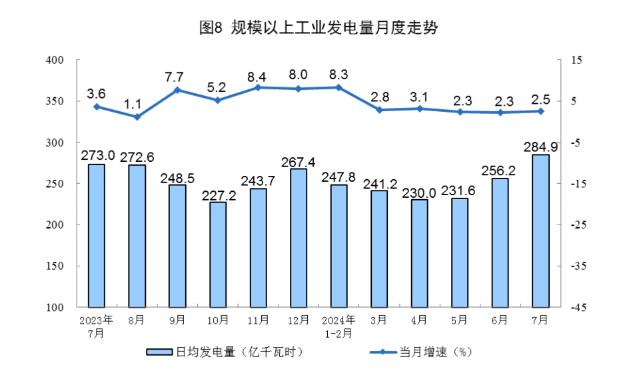 8月15日,國(guó)家統(tǒng)計(jì)局發(fā)布數(shù)據(jù)顯示,規(guī)模以上工業(yè)(以下簡(jiǎn)稱“規(guī)上工業(yè)”)電力生產(chǎn)略有加快。7月,規(guī)上工業(yè)發(fā)電量8831億千瓦時(shí),同比增長(zhǎng)2.5%,增速比6月加快0.2個(gè)百分點(diǎn);規(guī)上工業(yè)日均發(fā)電284.9億千瓦時(shí)。1—7月,規(guī)上工業(yè)發(fā)電量53239億千瓦時(shí),同比增長(zhǎng)4.8%。
