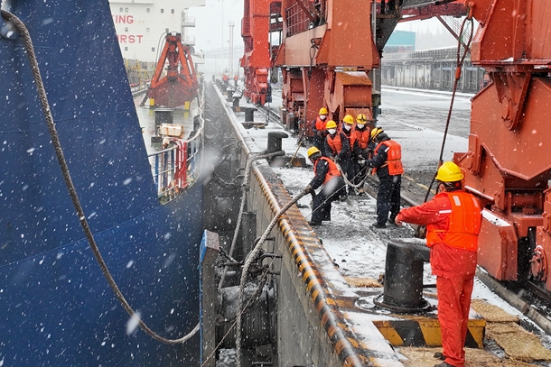 圖為燃料人員正在風(fēng)雪中進行海輪帶纜作業(yè)