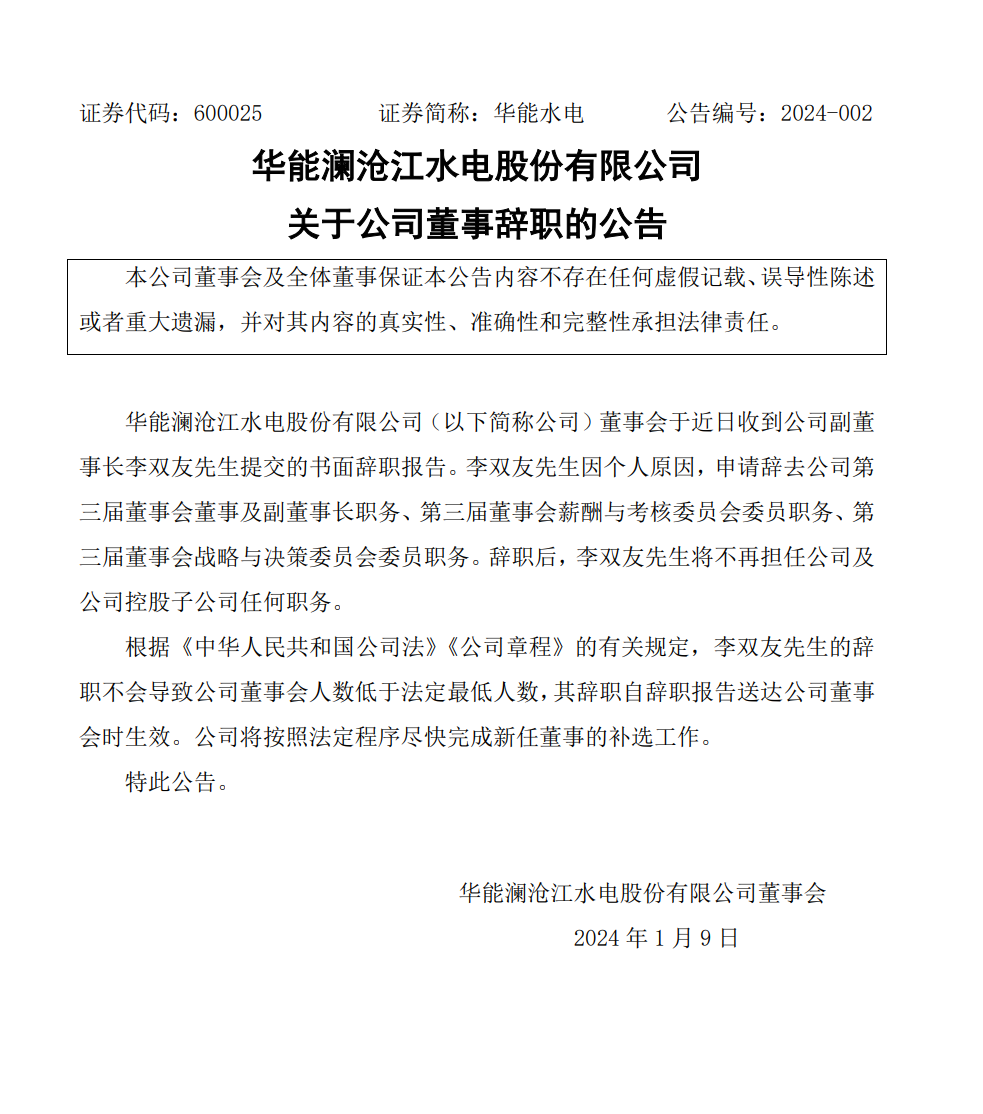 李雙友辭去華能瀾滄江水電股份有限公司(以下簡(jiǎn)稱“華能水電”)董事及副董事長(zhǎng)職務(wù)等職務(wù)。