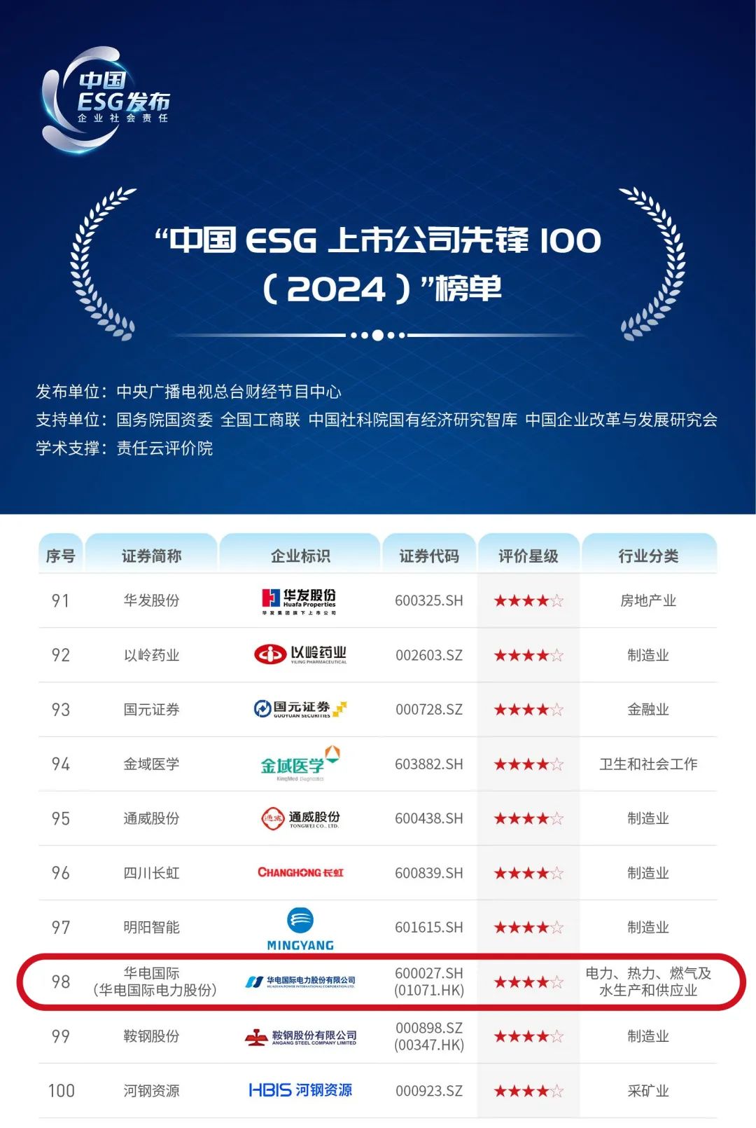6月30日下午,中央廣播電視總臺財經(jīng)節(jié)目中心聯(lián)合國務(wù)院國資委、全國工商聯(lián)、中國社科院國有經(jīng)濟研究智庫、中國企業(yè)改革與發(fā)展研究會在京正式發(fā)布“中國ESG(企業(yè)社會責(zé)任)《2024年度ESG行動報告》”?!秷蟾妗饭剂?ldquo;中國ESG上市公司先鋒100”榜單,中國華電所屬華電國際電力股份有限公司成功入圍。