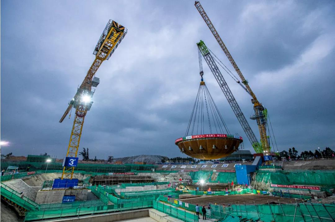 本次吊裝的鋼制安全殼底封頭為橢球形,由于鋼制安全殼底封頭體量大,為了便于加工和運輸,將鋼制安全殼底封頭分成50個瓣片,在現(xiàn)場拼裝完成后整體進(jìn)行吊裝。中核集團(tuán)海南核電牽頭中核工程、中核二二等參建單位成立玲龍首堆CV(鋼制安全殼)安裝黨員突擊隊,快速協(xié)調(diào)解決現(xiàn)場制約因素和問題,克服“獅子山”和“圓規(guī)”雙臺風(fēng)影響,確?,F(xiàn)場各項準(zhǔn)備工作有序開展,并通過了生態(tài)環(huán)境部華南核與輻射安全監(jiān)督站的現(xiàn)場檢查。