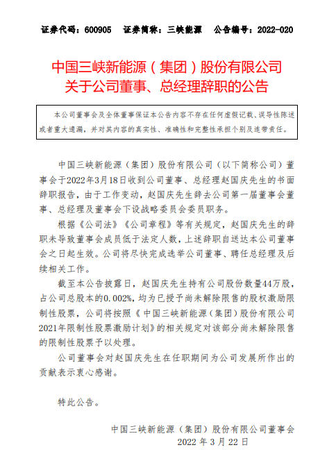 3月21日,三峽能源發(fā)布公告稱,公司董事會于3月18日收到公司董事、總經(jīng)理趙國慶的書面辭職報告,由于工作變動,趙國慶先生辭去公司第一屆董事會董事、總經(jīng)理及董事會下設(shè)戰(zhàn)略委員會委員職務(wù)。