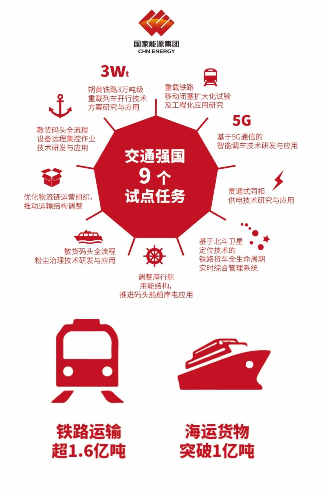為貫徹落實(shí)黨的十九大關(guān)于建設(shè)交通強(qiáng)國(guó)的戰(zhàn)略部署,國(guó)家能源集團(tuán)承擔(dān)了《朔黃鐵路3萬(wàn)噸級(jí)重載列車開(kāi)行技術(shù)方案研究與應(yīng)用》《基于北斗衛(wèi)星定位技術(shù)的鐵路貨車全生命周期實(shí)時(shí)綜合管理系統(tǒng)》《重載鐵路移動(dòng)閉塞擴(kuò)大化試驗(yàn)及工程化應(yīng)用研究》《貫通式同相供電技術(shù)研究與應(yīng)用》《基于5G通信的智能調(diào)車技術(shù)研發(fā)與應(yīng)用》《調(diào)整港行航用能結(jié)構(gòu),推進(jìn)碼頭船舶岸電應(yīng)用》《散貨碼頭全流程粉塵治理技術(shù)研發(fā)與應(yīng)用》《優(yōu)化物流鏈運(yùn)營(yíng)組織,推動(dòng)運(yùn)輸結(jié)構(gòu)調(diào)整》《散貨碼頭全流程設(shè)備遠(yuǎn)程集控作業(yè)技術(shù)研發(fā)與應(yīng)用》等9個(gè)試點(diǎn)任務(wù),對(duì)能源供給安全和交通強(qiáng)國(guó)建設(shè)起到了引領(lǐng)示范作用。