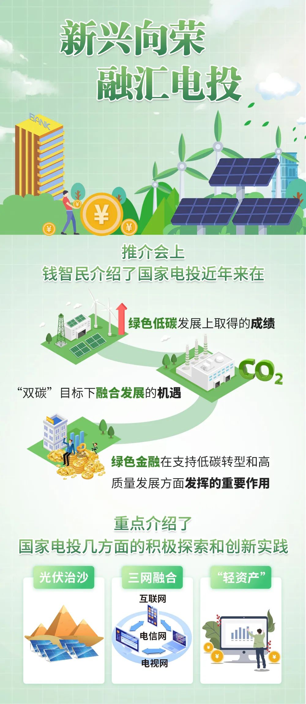 “錢智民介紹道,國家電投作為我國唯一擁有核電、火電、水電、風電、光伏發(fā)電、生物質發(fā)電等全部發(fā)電類型的能源企業(yè),深入踐行習近平總書記關于清潔低碳發(fā)展的重要指示批示精神,以“創(chuàng)造綠色價值”為使命,以“綠色 創(chuàng)新 融合,真信 真干 真成”為核心價值觀,制定了面向新時代的“2035一流戰(zhàn)略”,在綠色低碳發(fā)展上取得了顯著成效。目前,國家電投裝機總規(guī)模已突破2億千瓦,新能源發(fā)電裝機量、可再生能源發(fā)電裝機量、清潔能源發(fā)電裝機量均居世界第一。他表示,在全球能源結構向非化石能源轉型的進程中,把握“風光無限”的未來機遇取決于新能源技術創(chuàng)新,更取決于金融。我們愿與金融企業(yè)共同發(fā)力,為實現(xiàn)中國能源清潔低碳轉型貢獻更大力量。”