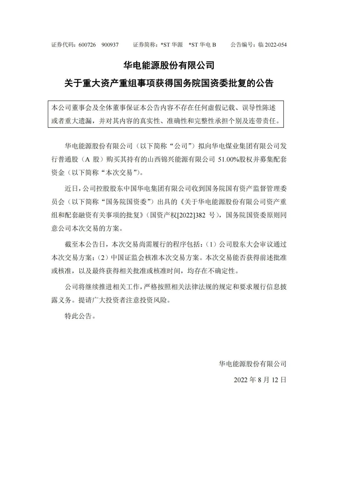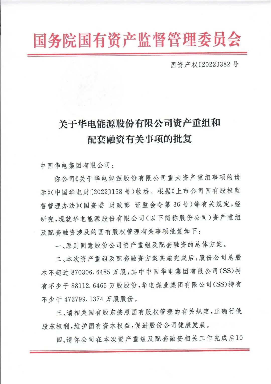 華電能源也發(fā)布公告,確認重大資產(chǎn)重組事項獲得國務院國資委批復。