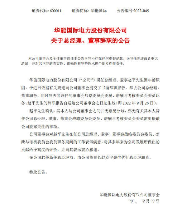 9月27日,華能國際發(fā)布關(guān)于總經(jīng)理、董事辭職的公告。華能國際現(xiàn)任總經(jīng)理、董事趙平先生因年齡原因,于近日依據(jù)有關(guān)規(guī)定向公司董事會(huì)提交了書面辭職報(bào)告,辭去公司總經(jīng)理、董事職務(wù),同時(shí)辭去其兼任的董事會(huì)戰(zhàn)略委員會(huì)委員、薪酬與考核委員會(huì)委員職務(wù)。趙平先生的辭職報(bào)告自送達(dá)公司董事會(huì)之日起生效(即2022年9月26日)。