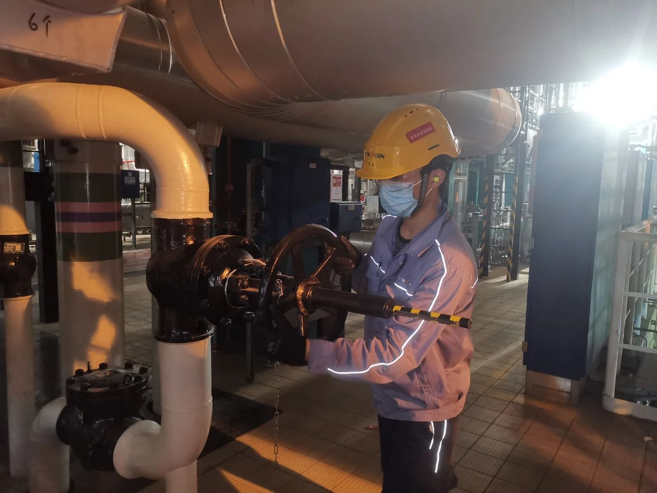 大亞灣核電運(yùn)行三部現(xiàn)場(chǎng)操作員王景瑞對(duì)發(fā)電機(jī)供氫閥進(jìn)行檢查