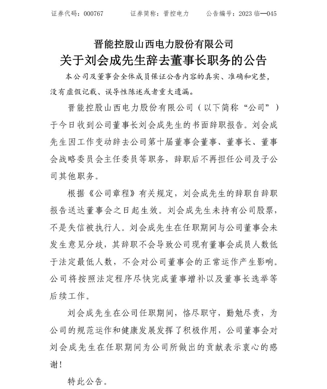 10月11日,晉能控股山西電力股份有限公司發(fā)布公告,劉會成因工作變動辭去公司第十屆董事會董事、董事長、董事會戰(zhàn)略委員會主任委員等職務(wù),辭職后不再擔任公司及子公司其他職務(wù)。