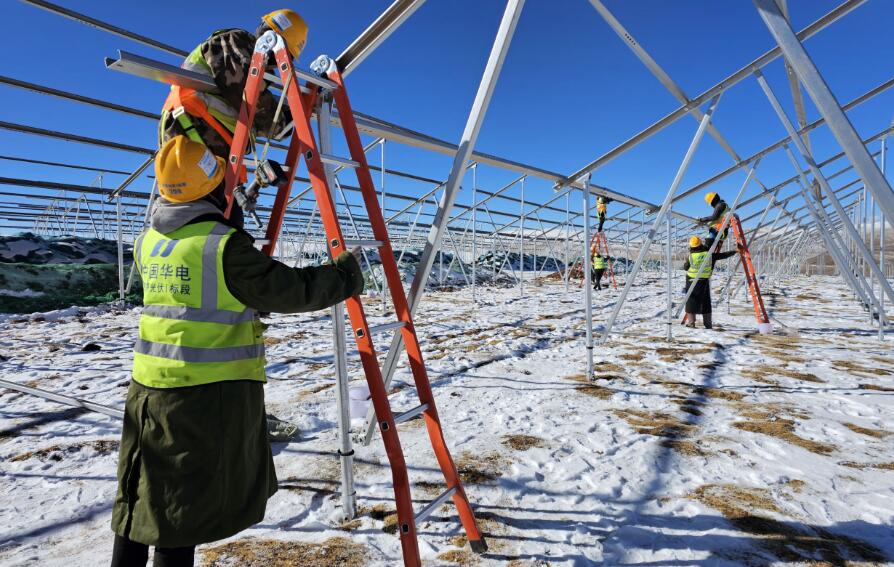 金上昂多項(xiàng)目現(xiàn)場(chǎng)雪一停,施工人員立即搶抓時(shí)間安裝光伏支架。