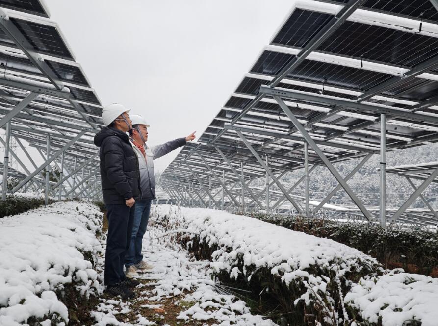 福建泰寧朱口水茜光伏項(xiàng)目建設(shè)現(xiàn)場(chǎng)白雪皚皚,一線職工增加巡檢頻率,認(rèn)真檢查加固光伏板,避免積雪壓垮組件或支架。