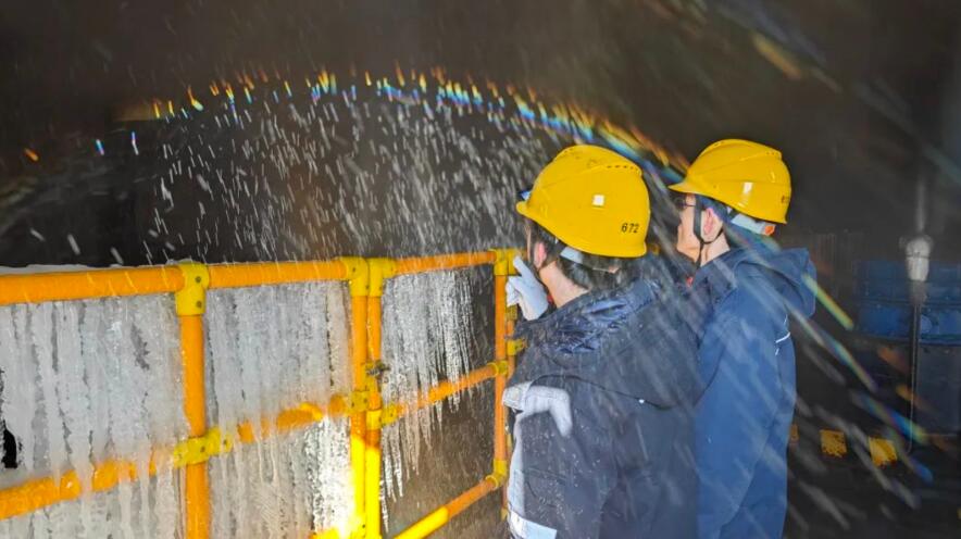 周寧抽蓄公司及時(shí)發(fā)布降溫、冰凍、雨雪等預(yù)警信息和風(fēng)險(xiǎn)提示,一線人員堅(jiān)守崗位,對(duì)戶外管道電纜、電氣配電柜等設(shè)備進(jìn)行防凍檢查和增加掃雪頻次,確保大型“充電寶”輸出汩汩綠色電能。邵武能源公司迎“寒”而上,強(qiáng)化燃煤保障,一線人員在零下6度、雪花漫天飛舞的戶外,對(duì)伴熱蒸汽管道、升壓站、冷卻塔等設(shè)備開展全方位防寒防凍專項(xiàng)檢查。海拔1348米的寧化雞公崠風(fēng)電場(chǎng)最高積雪達(dá)到20厘米,該場(chǎng)站迅速啟動(dòng)防極端天氣應(yīng)急預(yù)案,提前預(yù)置應(yīng)急力量,運(yùn)用“無(wú)人機(jī)+視頻監(jiān)控+人工特巡”的立體化方式,開展風(fēng)機(jī)、線路、升壓站的覆冰積雪情況檢測(cè)。