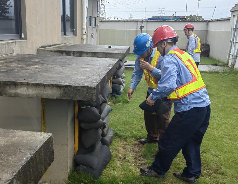 ▲上海電力長興燃機電廠一線員工在補給水泵房區(qū)域?qū)︼L道口布置沙袋,確保防汛無死角。
