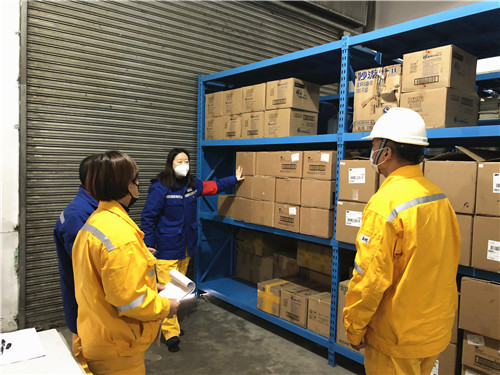 本次檢查采取“對賬銷號”的形式嚴格對照擬定的《復工復產(chǎn)疫情防控監(jiān)督檢查表》《江蘇大區(qū)疫情防控監(jiān)督工作表》進行檢查,確保檢查內(nèi)容全覆蓋、檢查要點不遺漏。檢查組先后前往EHS部、辦公室、技術(shù)支持部、發(fā)電部檢查復工復產(chǎn)與疫情防控工作的制度建立、責任落實、人員防護、防疫準備等情況,掌握總體工作開展情況和必要的臺賬資料;同時深入公司食堂及倉庫區(qū)域,全面檢查食堂區(qū)域的菜品采購及入庫、衛(wèi)生消毒、體溫檢測、分餐規(guī)定等疫情防控措施落實情況,以及倉庫區(qū)域的防護物品儲備情況。