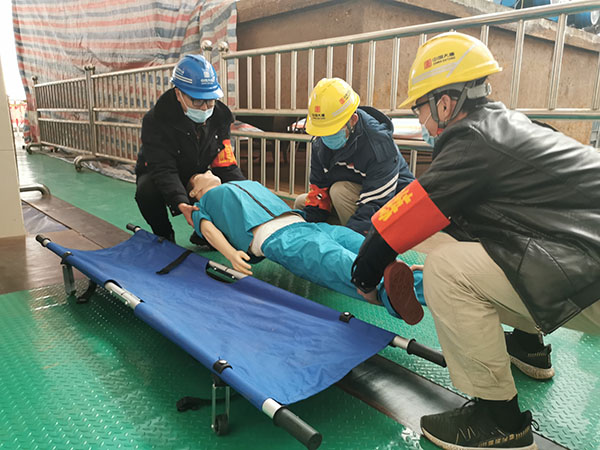 此次演練在主安裝廠2號機組大修現(xiàn)場進行,模擬兩名施工人員在轉(zhuǎn)輪支架3米多高的平臺上焊接縫隙,一名工作人員未系安全帶進行作業(yè),不慎摔倒墜落。該公司相關(guān)部門接到報告后,迅速啟動應(yīng)急機制,立即撥打120緊急電話,并通知應(yīng)急救援隊趕赴事故現(xiàn)場。救援現(xiàn)場,應(yīng)急隊員迅速判斷危險情況,并檢查傷員傷勢,大家齊心協(xié)力將傷員轉(zhuǎn)移到安全地帶,拉起警戒線,對傷員進行緊急檢查。救援人員發(fā)現(xiàn)傷者腿部骨折,無法行動,立即進行骨折包扎急救,按部就班、細致謹慎對傷口進行消毒、止血、固定、包扎。最后,傷員被順利送往醫(yī)院。