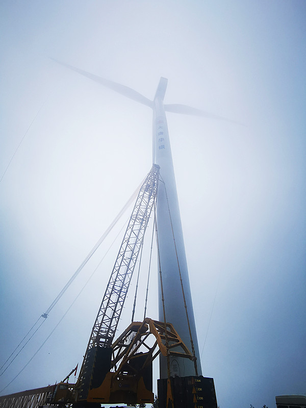 該項目自2021年8月2日全面開工建設以來,全員克服時間緊、任務重,以及夏季長時間高溫、近期溫度驟降、山上風力較大等重重困難,縝密部署,團結(jié)拼搏,以扎實的管理、良好的協(xié)調(diào)、有力的措施,特別是針對作業(yè)高峰期充分討論、采取舉措,在大件運輸、吊裝等工作中做到了有方案、有計劃、有落實。經(jīng)過節(jié)假無休、連續(xù)作戰(zhàn),先后完成了十臺風機基礎(chǔ)澆筑工作,并于10月13日正式完成首臺風機吊裝工作,呈現(xiàn)出“驕陽壁嶺轟聲震,崇山風嘯鐵臂搖”的一派火熱建設局面。