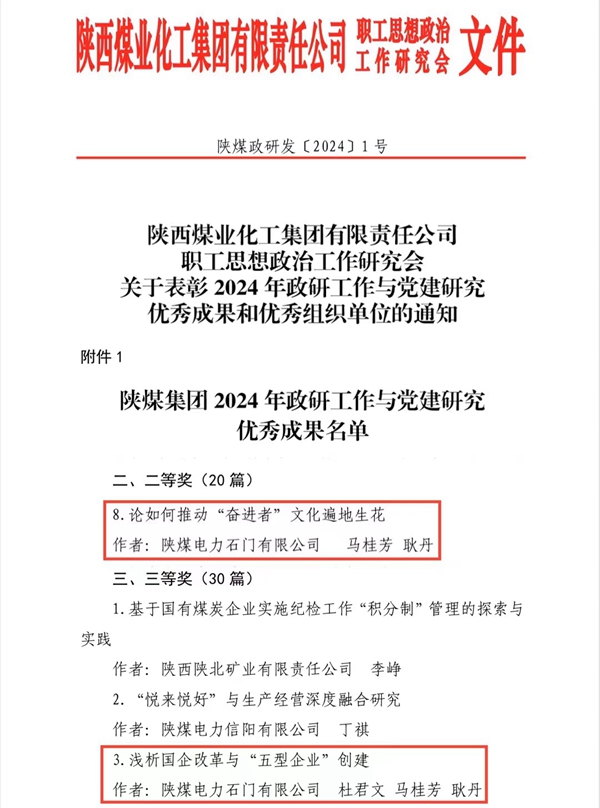 中國(guó)電力網(wǎng)訊 (通訊員:馬桂芳)10月30日,陜煤集團(tuán)思想政治工作研究會(huì)發(fā)布了《關(guān)于表彰2024年政研工作與黨建研究?jī)?yōu)秀成果和優(yōu)秀組織單位的通知》,陜煤石門(mén)發(fā)電公司2項(xiàng)政研課題獲表彰。其中,《論如何推動(dòng)“奮進(jìn)者”文化遍地生花》獲評(píng)集團(tuán)公司優(yōu)秀成果二等獎(jiǎng),《淺析國(guó)企改革與“五型企業(yè)”創(chuàng)建》獲評(píng)集團(tuán)公司優(yōu)秀成果三等獎(jiǎng)。