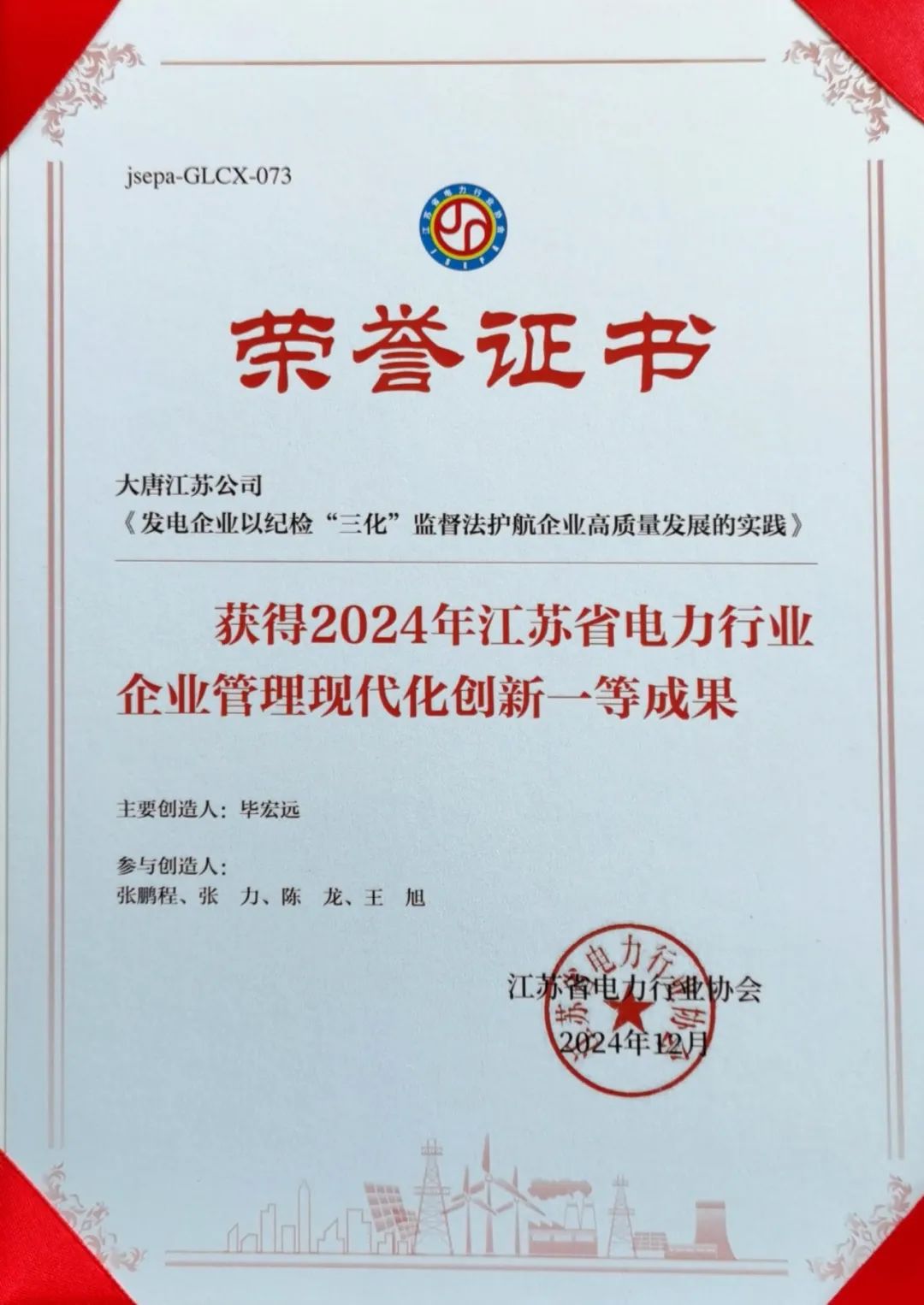 近期,江蘇公司紀(jì)委申報題為《發(fā)電企業(yè)以紀(jì)檢“三化”監(jiān)督法護(hù)航企業(yè)高質(zhì)量發(fā)展的實(shí)踐》案例榮獲2024年江蘇省電力行業(yè)企業(yè)管理現(xiàn)代化創(chuàng)新“一等成果”。