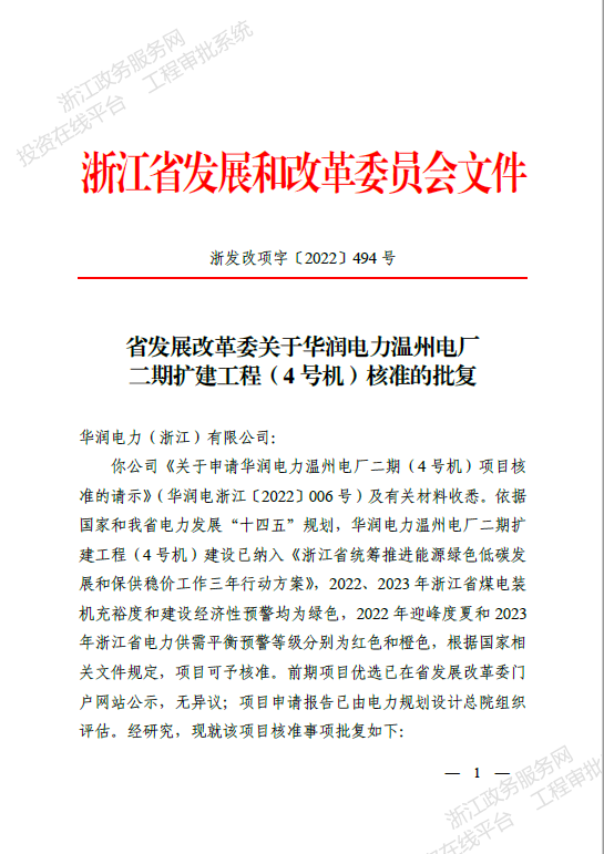 11月8日,華潤電力浙江公司溫州電廠4號機正式獲得浙江省發(fā)展和改革委員會核準批復。