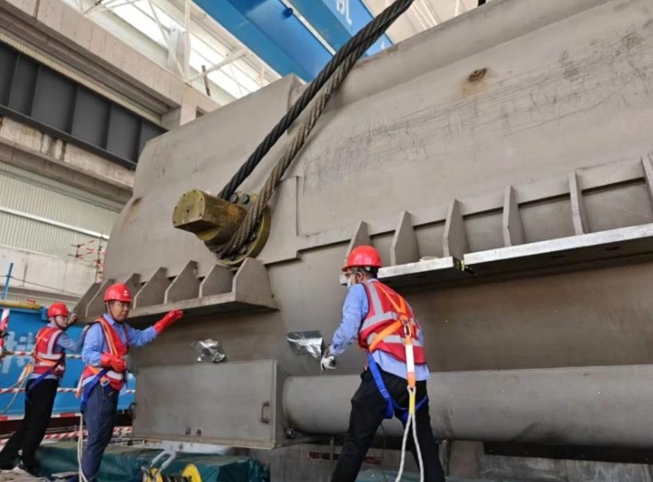 發(fā)電機(jī)定子作為主廠房?jī)?nèi)最重的單體設(shè)備,長(zhǎng)10.3米、寬4.868米、高4.7米,重達(dá)367噸。為確保發(fā)電機(jī)定子吊裝平穩(wěn)、就位精準(zhǔn),項(xiàng)目建設(shè)團(tuán)隊(duì)組織制定詳細(xì)的吊裝施工方案,提前做好設(shè)備和工器具保障,從場(chǎng)外運(yùn)輸至場(chǎng)內(nèi)卸車(chē)全過(guò)程反復(fù)推演,逐項(xiàng)落實(shí)。同時(shí),在吊裝期間實(shí)施全程監(jiān)督,嚴(yán)控安全質(zhì)量,確保整個(gè)吊裝過(guò)程安全、有序、可控。
