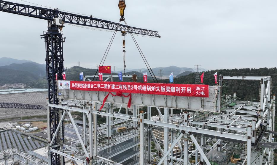 10月25日,中國能建浙江火電承建的臺二電二期項(xiàng)目3號機(jī)組鍋爐首根大板梁吊裝就位。