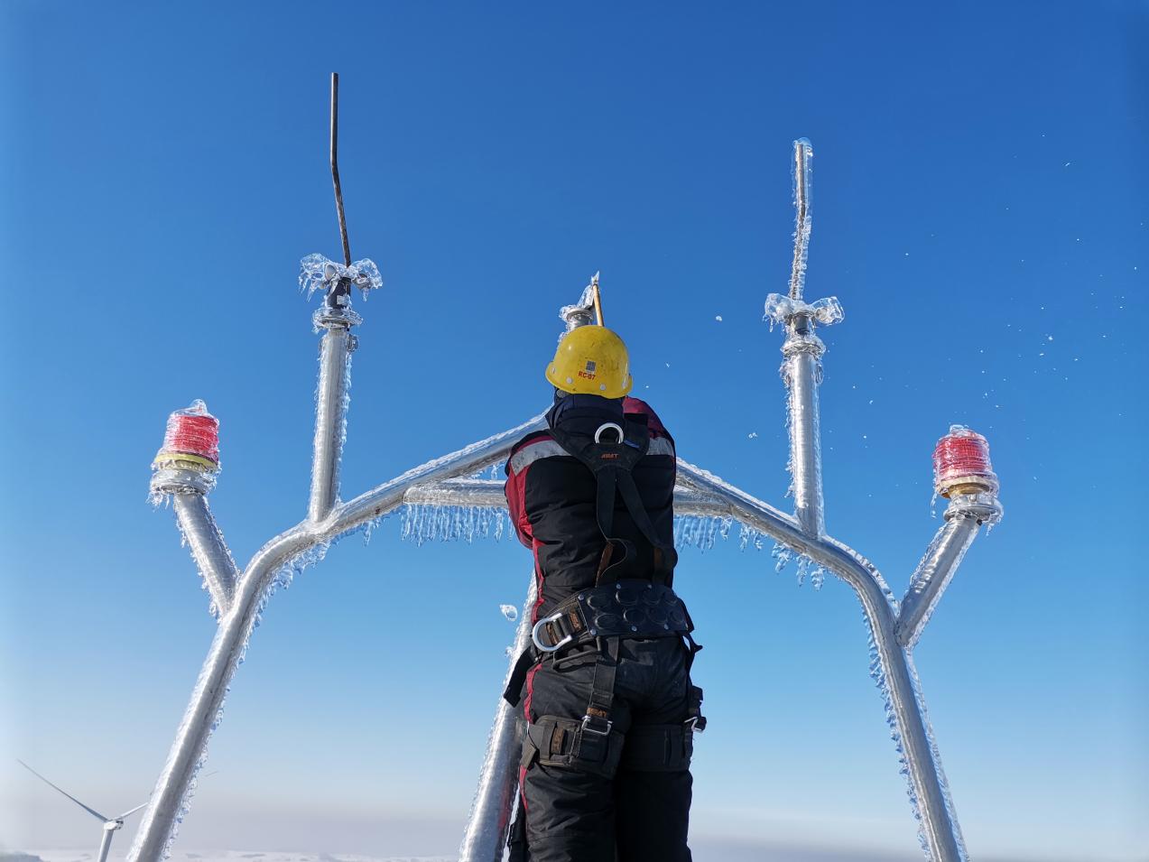 11月11日至12日,陽(yáng)光透過(guò)薄薄的云層,照耀著白茫茫的大地,反射出銀色的光芒。風(fēng)機(jī)逐漸恢復(fù)運(yùn)行,在重力和風(fēng)機(jī)葉片旋轉(zhuǎn)的作用下,裹冰會(huì)從葉片上脫落,由于受旋轉(zhuǎn)葉片的離心力作用,這些冰在沒(méi)有障礙物遮擋的情況下會(huì)被拋出數(shù)百米遠(yuǎn),存在安全隱患。風(fēng)電場(chǎng)隨即組織人員挨家挨戶告訴村民,近期不得靠近風(fēng)機(jī),注意人身安全。之后開(kāi)展機(jī)組風(fēng)速儀、風(fēng)向標(biāo)除冰工作,全面降低機(jī)組不可用時(shí)間,保障機(jī)組供電穩(wěn)定可靠。本次除冰消缺充分利用上海電氣風(fēng)機(jī)監(jiān)控系統(tǒng)后臺(tái),通過(guò)對(duì)比機(jī)組風(fēng)速和風(fēng)向、功率等數(shù)據(jù),分析判斷機(jī)組覆冰情況,對(duì)因雨雪冰凍天氣導(dǎo)致的風(fēng)速儀、風(fēng)向標(biāo)覆冰從而影響機(jī)組功率的問(wèn)題,及時(shí)派出“破冰突擊隊(duì)”。但是機(jī)艙頂部由于積雪、結(jié)冰,變得十分光滑。工作人員佩戴好安全帶,掛好雙鉤,迎難而上,勇敢破冰。同時(shí)也對(duì)加熱器、溫度傳感器及相關(guān)回路進(jìn)行細(xì)致檢查,對(duì)無(wú)法正常運(yùn)行的加熱器進(jìn)行及時(shí)更換,確保設(shè)備加熱良好,回路接線無(wú)松動(dòng),風(fēng)速儀、風(fēng)向標(biāo)工作正常。