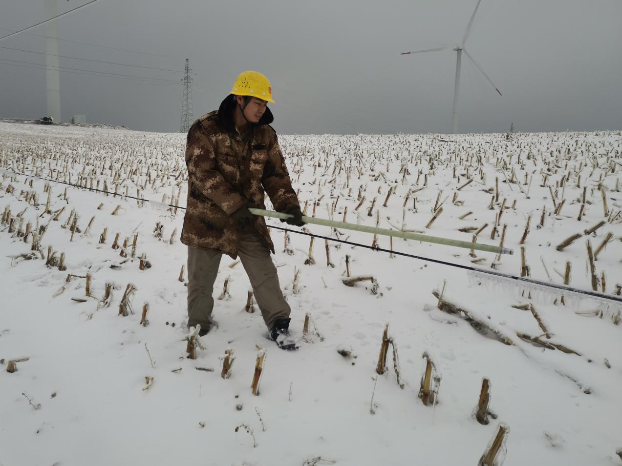 11月10日,瑟瑟寒風(fēng)能吹開(kāi)地上的積雪,卻無(wú)法阻止破冰小隊(duì)的腳步。這場(chǎng)持續(xù)兩天的雨雪剛一停,風(fēng)電場(chǎng)立即組織人員兵分兩路,迅速趕往現(xiàn)場(chǎng)。一組對(duì)升壓站35kV側(cè)通訊光纖、220kV側(cè)高壓一次設(shè)備采取人工打冰的方式對(duì)覆冰部位進(jìn)行處理,確保線路安全,以及再對(duì)升壓站電纜溝蓋板進(jìn)行清掃。另一組首先對(duì)風(fēng)機(jī)變頻器冷卻風(fēng)扇散熱網(wǎng)上的“冰罩”進(jìn)行破冰。避免風(fēng)機(jī)復(fù)位運(yùn)行后,變頻器冷卻風(fēng)扇散熱不及時(shí)的情況,導(dǎo)致設(shè)備損壞。之后再對(duì)線路進(jìn)行檢查,因受大風(fēng)和凍雨混合雙打,集電線路被冰包裹得嚴(yán)嚴(yán)實(shí)實(shí)的。經(jīng)檢查后并無(wú)損壞,否則電線結(jié)冰后,既要承受冰掛的重量,加上風(fēng)的影響,致使電線被壓斷。同時(shí),電塔也可能會(huì)承受較往常多十幾倍的電線重量,從而造成傾倒或折斷。還好只是塔架固定掉落,加上冰的重量才“葛優(yōu)躺”在地面上?,F(xiàn)場(chǎng)用絕緣桿進(jìn)行人工敲打。隨著敲打的進(jìn)行,電纜逐漸升起,這也減少了發(fā)生事故的可能。