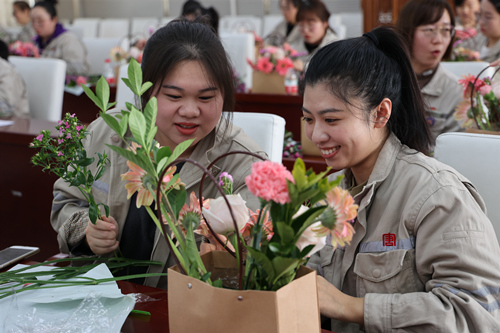 在公司“妙手生花 璽印芳華”慶“三八”創(chuàng)意插花活動現(xiàn)場,大家正興趣盎然、興高采烈的精心制作插花作品,不時(shí)傳來陣陣歡聲笑語。