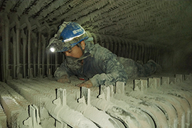 管排余溫散發(fā)熱浪,動一下粉塵便像揚(yáng)沙一樣落下,眼前一片迷離。借著爐膛內(nèi)頭燈的照明,能清晰看到在他們睫毛上落定的塵埃......