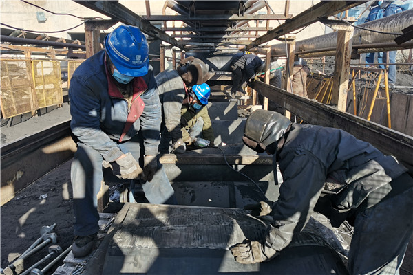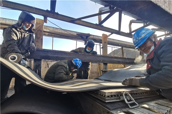 5日上午,工作人員做好粘接皮帶準(zhǔn)備工作,負(fù)責(zé)這次搶修工作的皮帶班,目前編制只有三名職工,承擔(dān)此次工作,顯然兩天內(nèi)完不成皮帶粘接任務(wù),燃運(yùn)分場(chǎng)打破常規(guī),合理分配人員,調(diào)派分場(chǎng)其他班組支援搶修,在剛剛完成三天搶修任務(wù)的情況下,克服困難繼續(xù)投入到搶修中。他們分工作業(yè)、分組負(fù)責(zé),一組用電火焊、導(dǎo)鏈、撬棍等工具修復(fù)皮帶滾筒,一組對(duì)斷裂皮帶進(jìn)行切割、打磨、對(duì)口、清洗、粘接和硫化等處理,同樣是在室外寒冷天氣搶修,汗水浸濕了他們的衣領(lǐng)和帽子,加上空間狹小,他們克服了重重困難,團(tuán)結(jié)作戰(zhàn),中午來不及休息,午飯后又繼續(xù)搶修工作,沒有一個(gè)人叫苦叫累,以頑強(qiáng)的毅力完成了當(dāng)天的皮帶粘接任務(wù)。