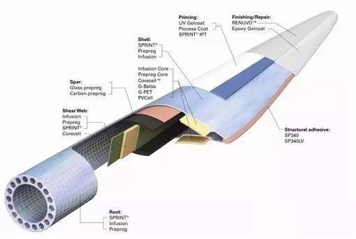 預(yù)浸料是生產(chǎn)復(fù)雜形狀結(jié)構(gòu)件的理想工藝,預(yù)浸料在國外運用非常廣泛,其工藝及設(shè)備也發(fā)展到成熟階段。實際生產(chǎn)中,由于葉片的蒙皮、主梁、根部等各個部位的力學(xué)性能及工藝的要求各不相同,因而,在不影響性能的條件下,為了降低成本,不同部分使用不同的預(yù)浸料。