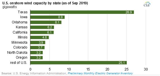 截至2019年第三季度,美國有41個州安裝了風力渦輪機。德克薩斯州的裝機容量最大,為26.9吉瓦,其次是愛荷華州,俄克拉荷馬州和堪薩斯州。這四個州占美國總裝機容量的一半。