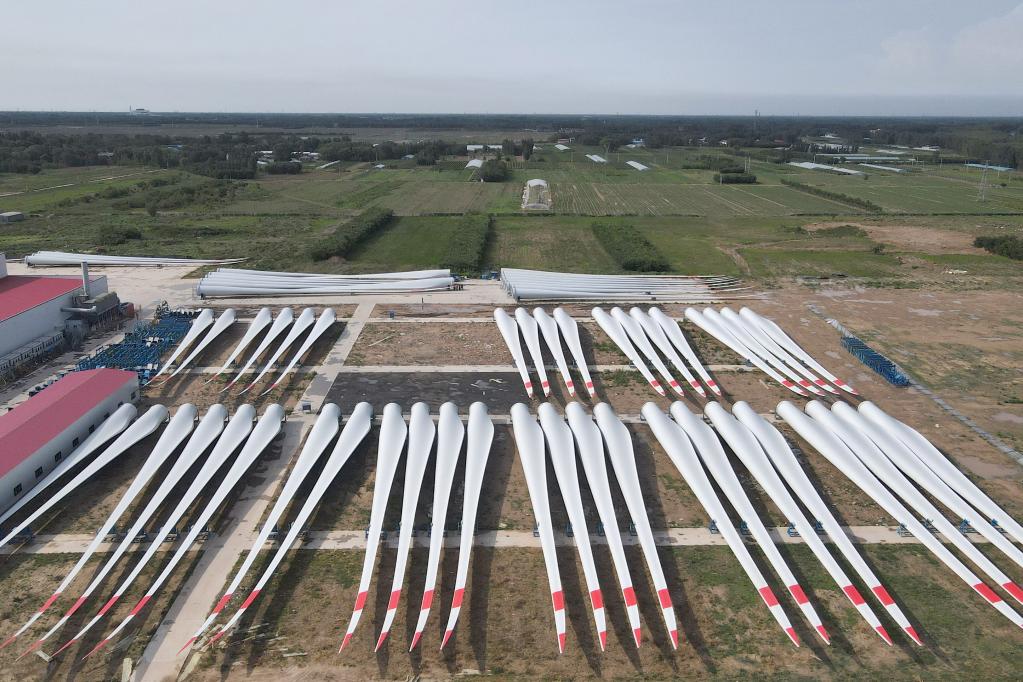 6月30日拍攝的河北省威縣一家風(fēng)電機(jī)組葉片制造企業(yè)生產(chǎn)的大型風(fēng)電機(jī)組葉片(無人機(jī)照片)。 新華社記者 駱學(xué)峰 攝