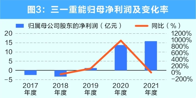 營業(yè)收入的高增長也帶來了三一重能盈利能力的快速提升。2019年至2021年,公司實現歸屬于母公司所有者的凈利潤1.26億元、13.72億元和15.91億元,增速分別為137.19%、992.53%和16.01%(見圖)。
