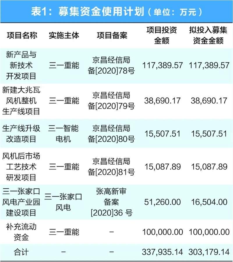 資料顯示,三一重能擬投入30.32億元募集資金用于風機產品相關技術的開發(fā)。募集資金投資項目主要投資方向圍繞風機產品、核心零部件、后市場服務等相關領域開展技術研發(fā)、產線升級、產能擴建,符合重點投向科技創(chuàng)新領域的要求。預期項目建成后將擴大公司在未來大兆瓦風力發(fā)電機市場上的占有率,從而保持市場競爭優(yōu)勢(見表)。