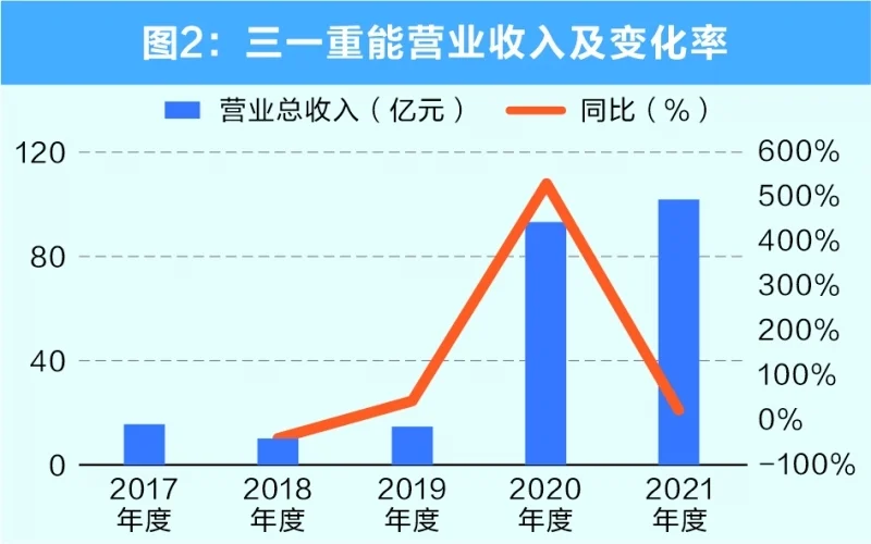 得益于風電行業(yè)整體的快速發(fā)展,以及公司自身產品的逐步成熟,及補貼退坡前的風電搶裝潮驅動,三一重能業(yè)務規(guī)模呈現跨越式發(fā)展。2019年至2021年,三一重能分別實現營業(yè)收入14.81億元、93.11億元和101.75億元,同比增長43.14%、528.57%和9.28%(見圖)。