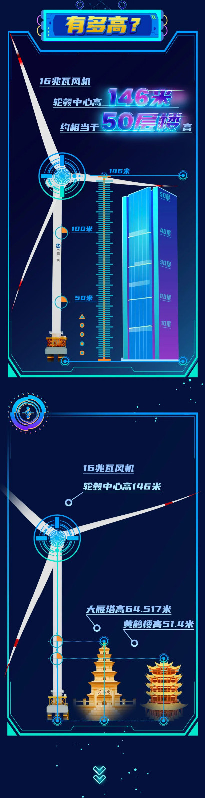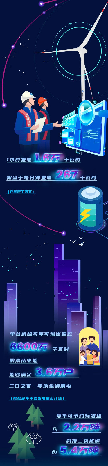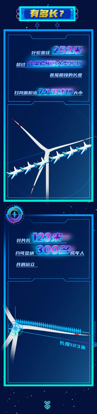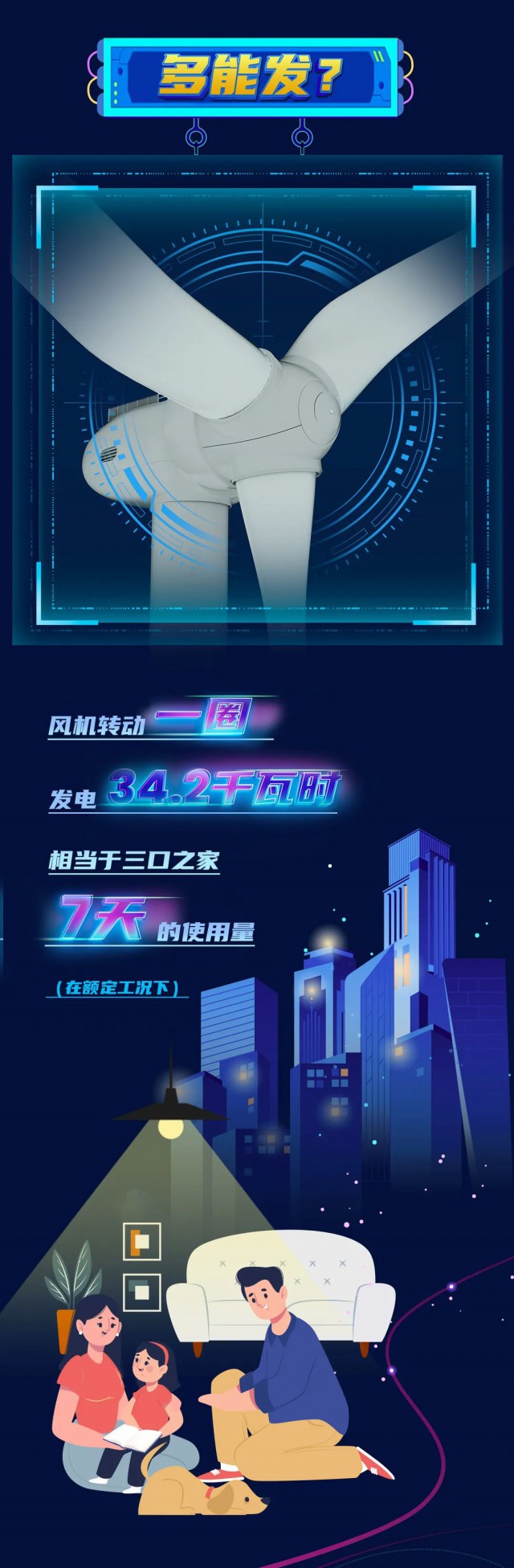 此次下線的單機容量16兆瓦海上風(fēng)電機組,葉輪直徑252米,葉輪掃風(fēng)面積約5萬平方米,約相當(dāng)于7個標(biāo)準(zhǔn)足球場大;輪轂高度達(dá)146米,約相當(dāng)于一座50層大樓的高度。在額定工況下,單臺機組每轉(zhuǎn)動一圈可發(fā)電34.2千瓦時。根據(jù)多年平均發(fā)電量設(shè)計值,單臺機組每年可輸出超過6600萬千瓦時的清潔電能,能夠滿足3.6萬戶三口之家一年的生活用電,可節(jié)約標(biāo)煤約2.2萬噸,減排二氧化碳約5.4萬噸。